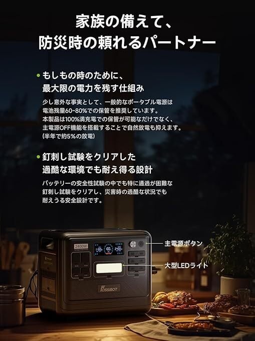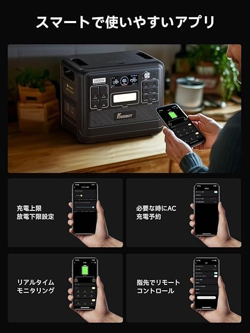【ポータブル電源とソーラーパネルのお得なセット】FOSSiBOT ポータブル電源 2400 と ソーラーパネル 420 を組み合わせたお得なセットです。日中にソーラーパネルで集めた電気をポータブル電源に蓄電することで、電気代を減らしながら地球環境にやさしいエコなライフスタイルを実現することができます。使用時や充電時の音が50db以下の静音設計のため、アウトドアで自然の音を楽しみながらご使用いただけます。
