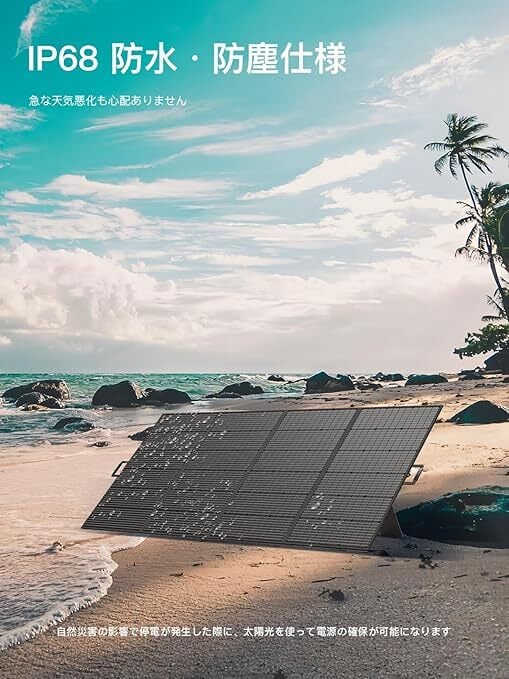 軽量折り畳み式の設計、太陽光を最大限吸収するため展開時の横幅は約2.2mですが、折り畳み時はわずか0.55m、どこでも持ち運び可能です。優れたIP68防水防塵性能を備え、防水性と耐久性が高い素材を採用し、屋外使用に設計され、レザー製のハンドル付きって持ち運びやすいです。背面収納ポケット付き、付属品に加え、ケーブルなどの小物も収納できます。キャンプ、ハイキング、登山などのアウトドアに最適です。